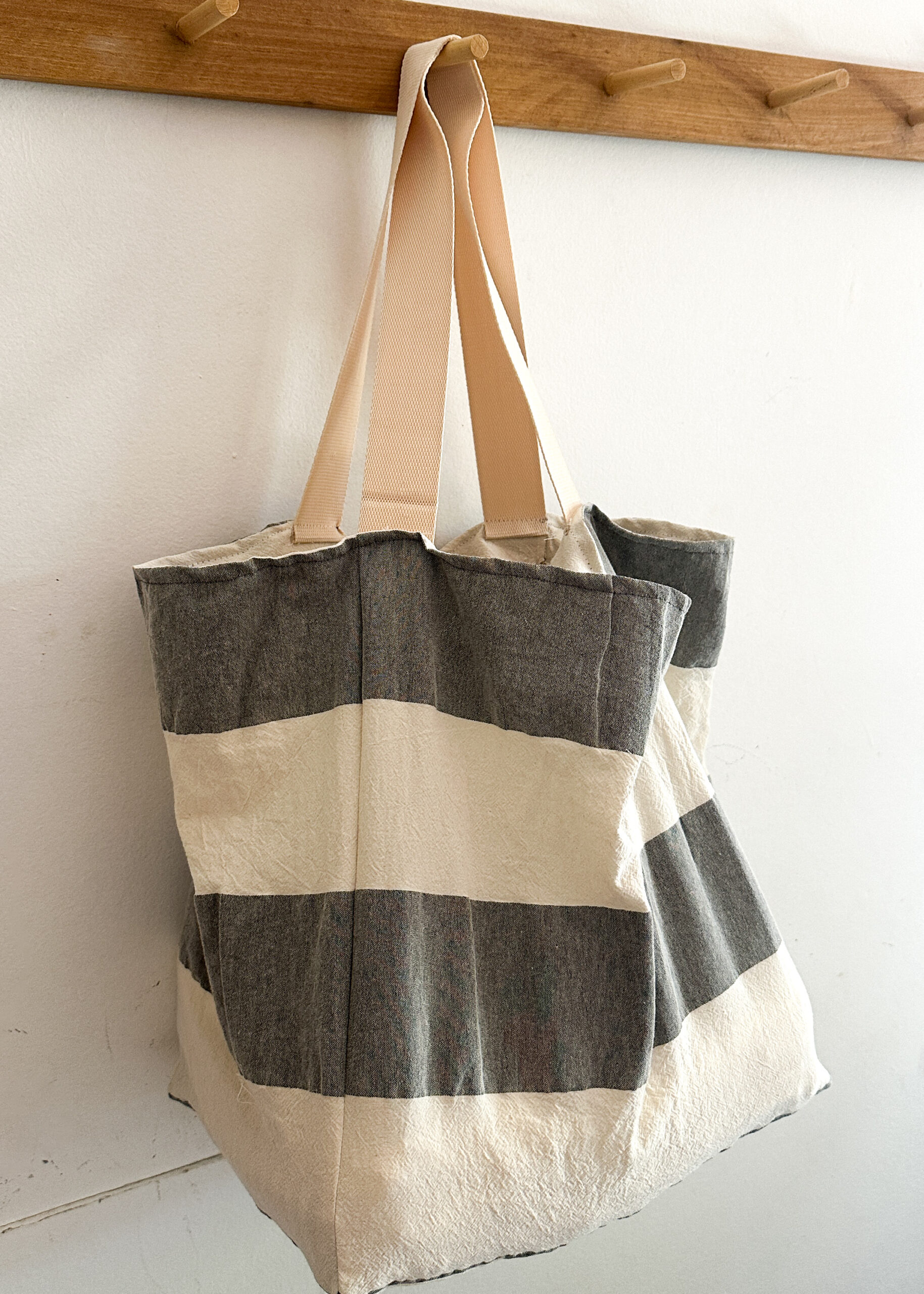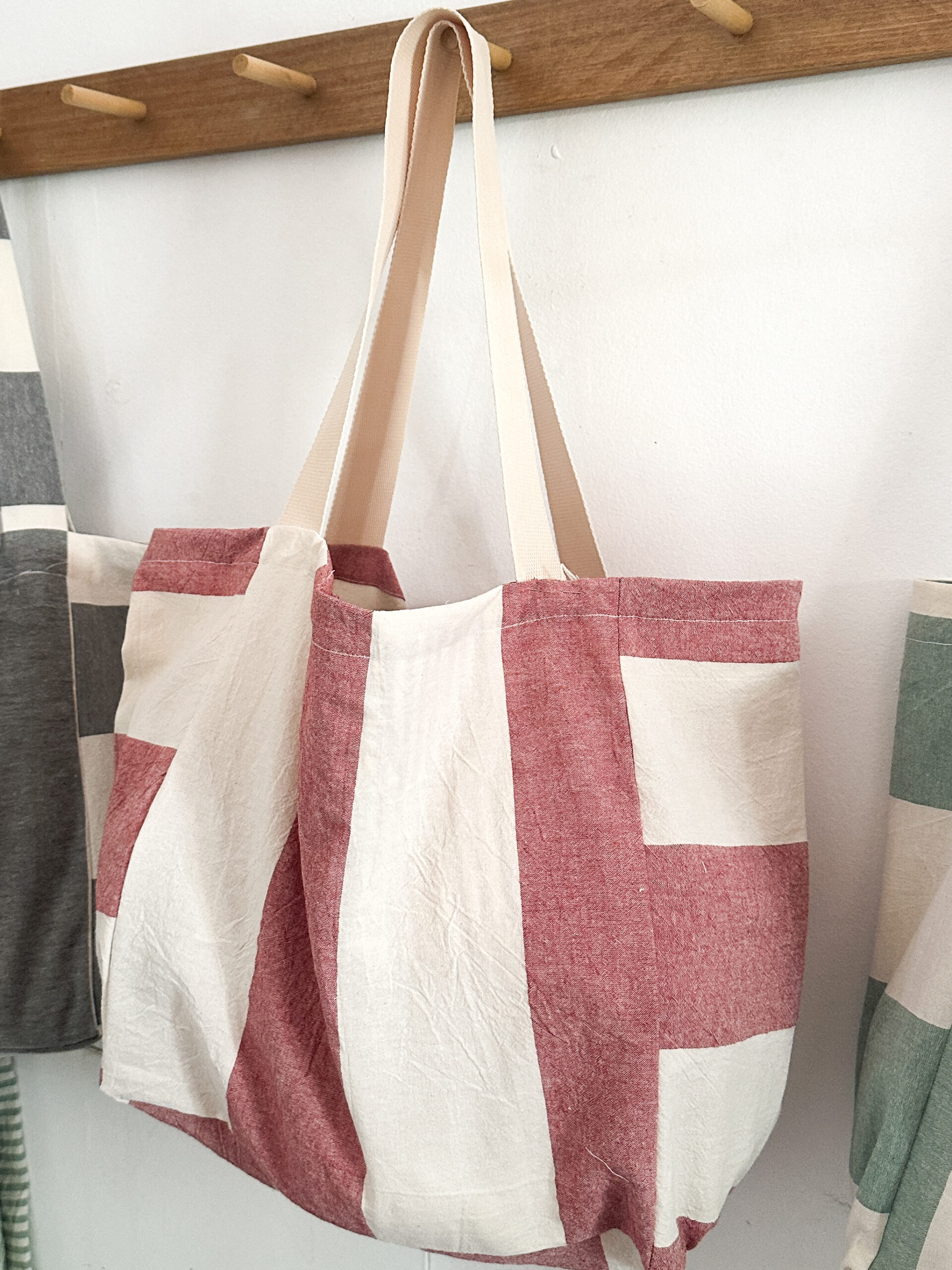 Bolso playero rayado en tonos tinto y blanco, confeccionado en tussor, una tela liviana, resistente y con textura natural. Ideal para acompañarte en días de playa, pileta o salidas de verano, combinando comodidad y estilo.