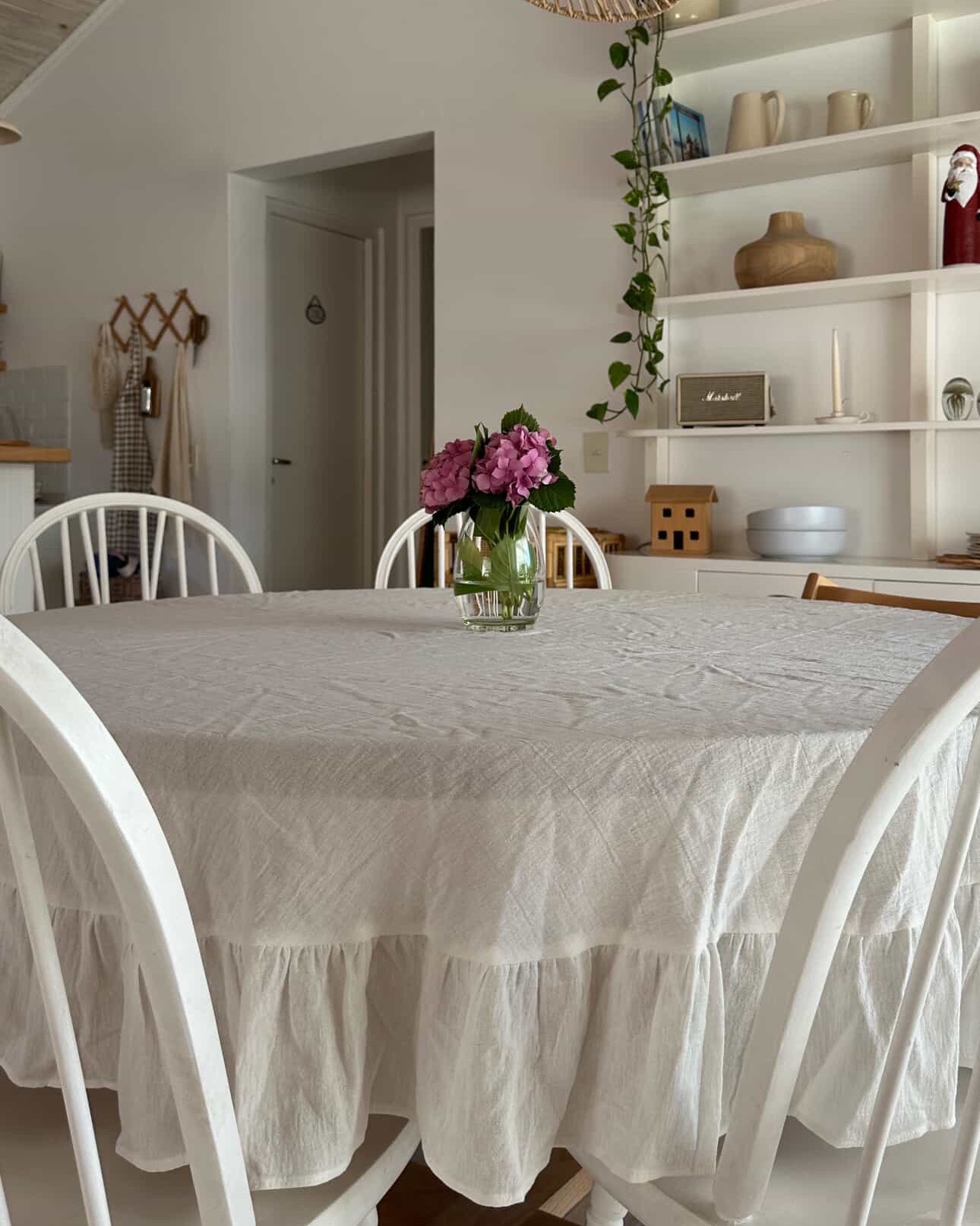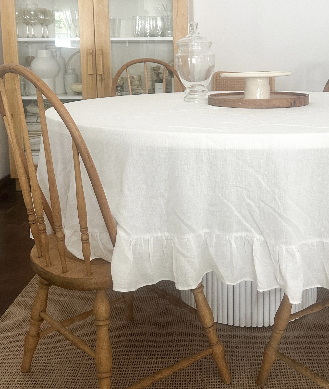 Mantel redondo de tussor en color natural, con un volado amplio y delicado que aporta movimiento y una textura suave y elegante. Ideal para vestir la mesa con un estilo cálido, simple y atemporal. Perfecto para usar todos los días o para darle un toque especial a cualquier encuentro.