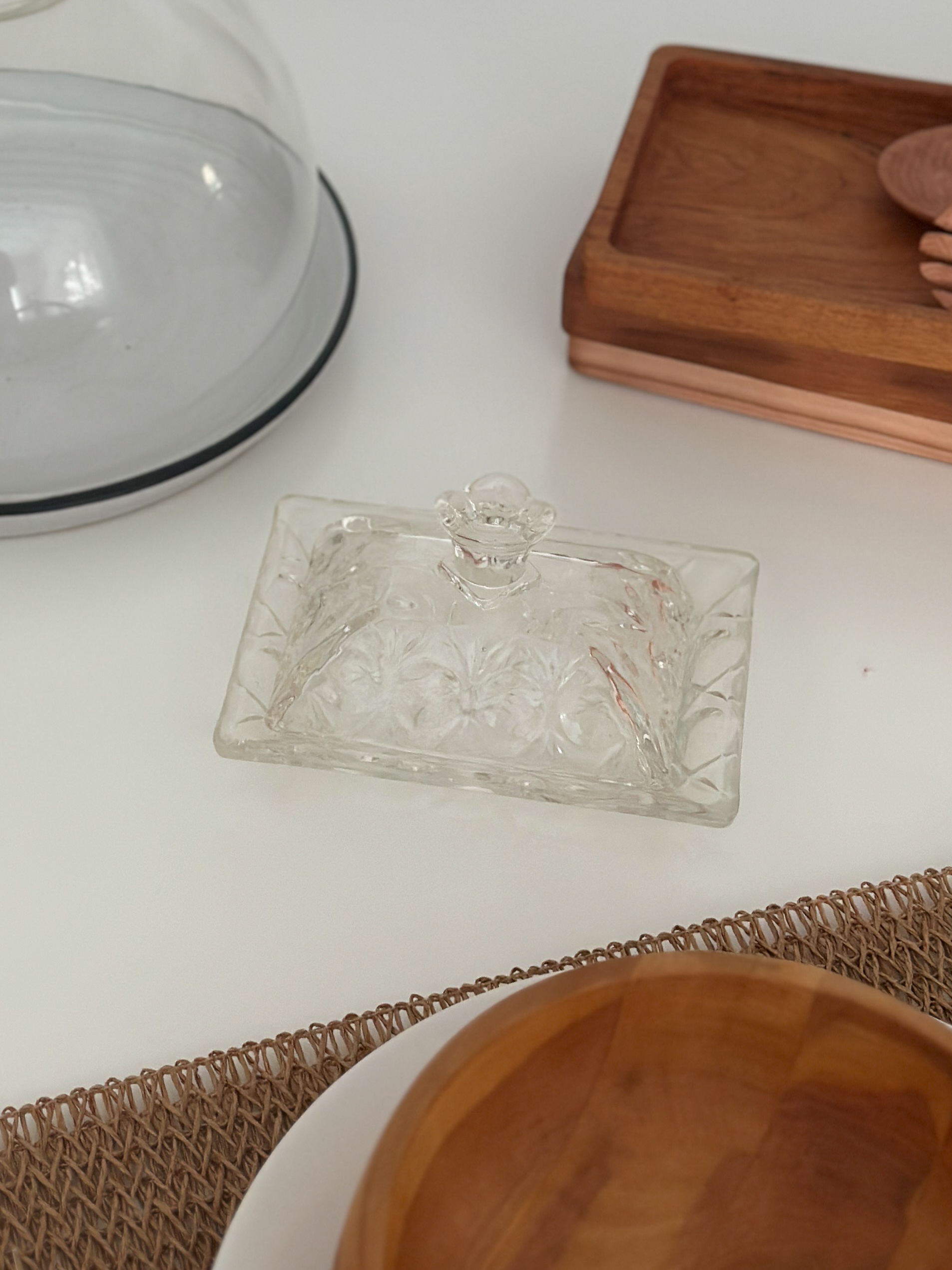Mantequera de vidrio transparente con delicado labrado floral, un diseño clásico que aporta elegancia y luz a la mesa. Su tapa con tirador facilita el uso diario mientras protege la manteca, manteniéndola fresca. Ideal para desayunos, brunch o mesas especiales, combina perfectamente con vajilla moderna o vintage. Una pieza funcional y decorativa que realza cualquier cocina o comedor.
