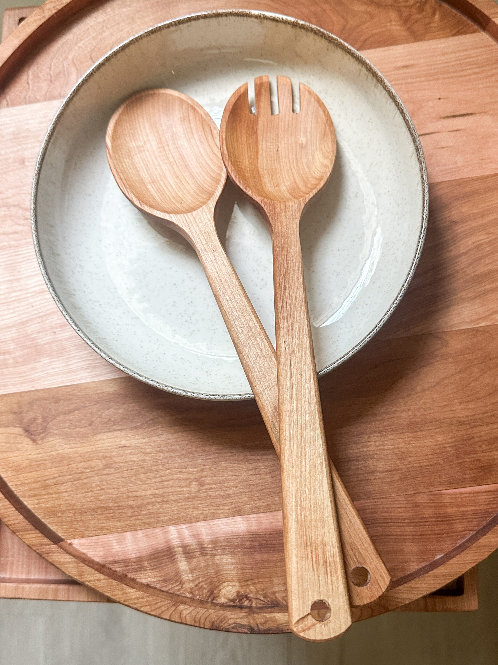 Set de dos cucharas de madera maciza, ideales para preparar y servir ensaladas o para uso diario en la cocina. Su largo permite un manejo cómodo y seguro, mientras que el diseño simple y natural resalta la belleza de la madera.